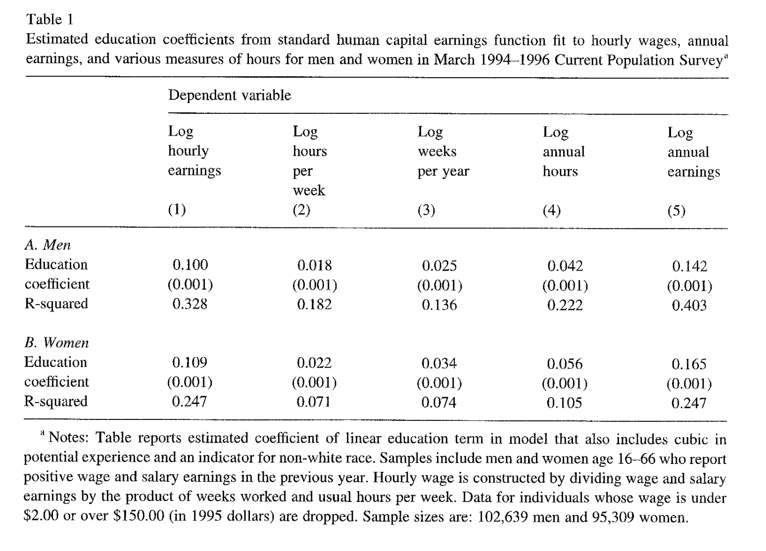 Every column here is from a different regression: the first column predicts the log hourly earnings from years of education, the fifth column predicts the log annual earnings from years of education, and so on. For now, let’s focus on the first column, which states the linear regression as follows: