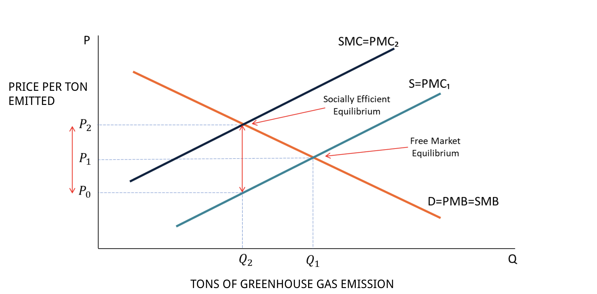 Let’s say that Peter’s Pens Limited is operating in a market where the government aims to make firms internalize the negative externality created by pollution from their production. From earlier, we know that the government may choose between prescriptive or market-based policies, but for this case we assume they chose the latter. In that case, the government introduces a Pigouvian tax on per ton of emitted from all firms. As any Pigouvian tax, its rate is set to the social marginal cost of the negative externality it is set to internalize. This is the social cost of carbon, quantified by extensive research. In the big picture, it pushes the private marginal cost towards the higher social marginal cost of emissions. As with any price increase, we assume the ‘supplied’ quantity of emissions to be pushed leftwards (decreased). This results in a new equilibrium quantity of emissions at a higher price (= social marginal cost) and the quantity reached becomes the optimal quantity of emissions in society. This can be seen in the diagram below. Now, how does the management of Peter’s Pens Limited react to the new market conditions?